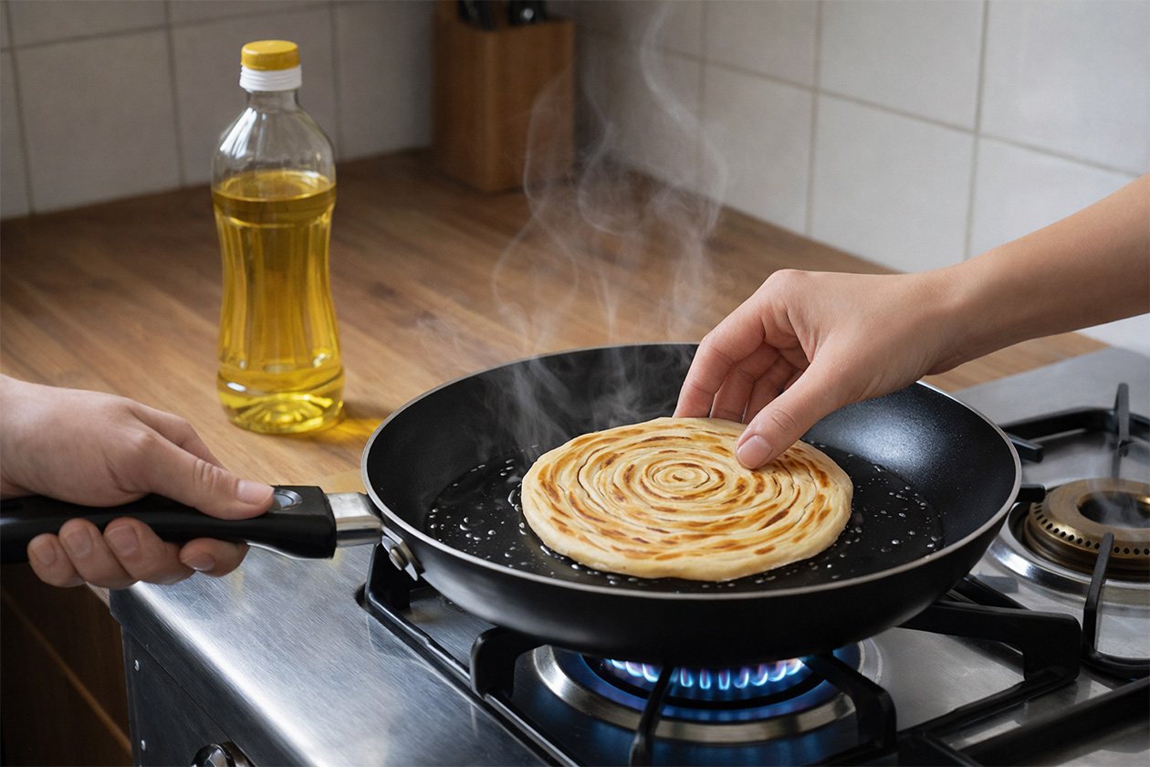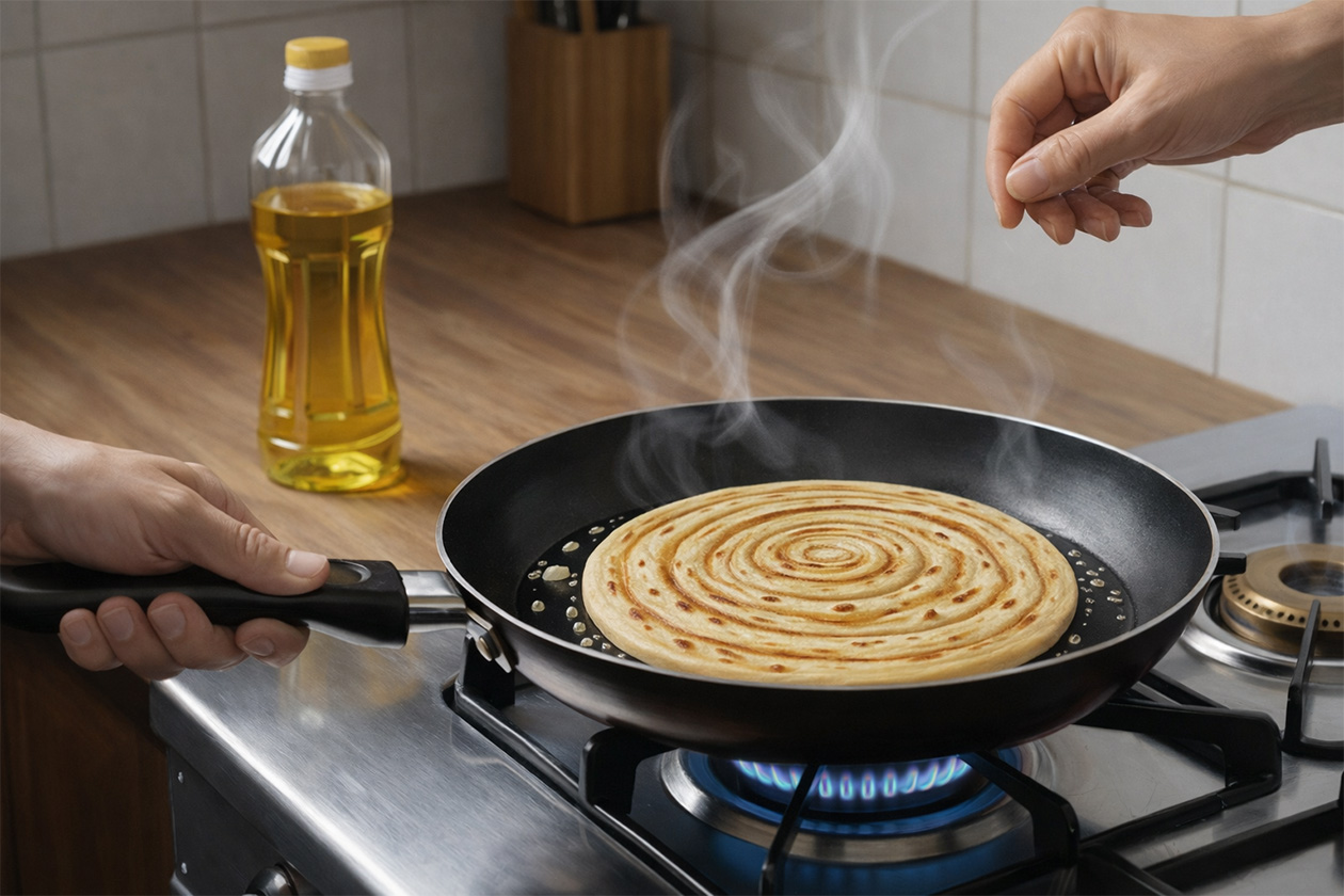 Place the paratha on the heated tawa.